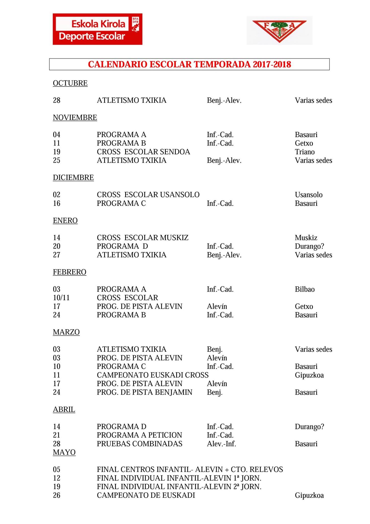 CALENDARIO ESCOLAR TEMPORADA 2017-2018 (este calendario es provisional puede ser modificado por la Federación)