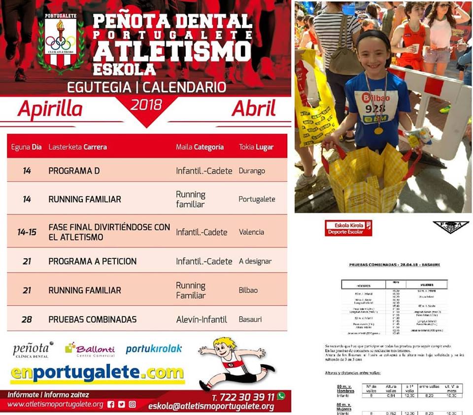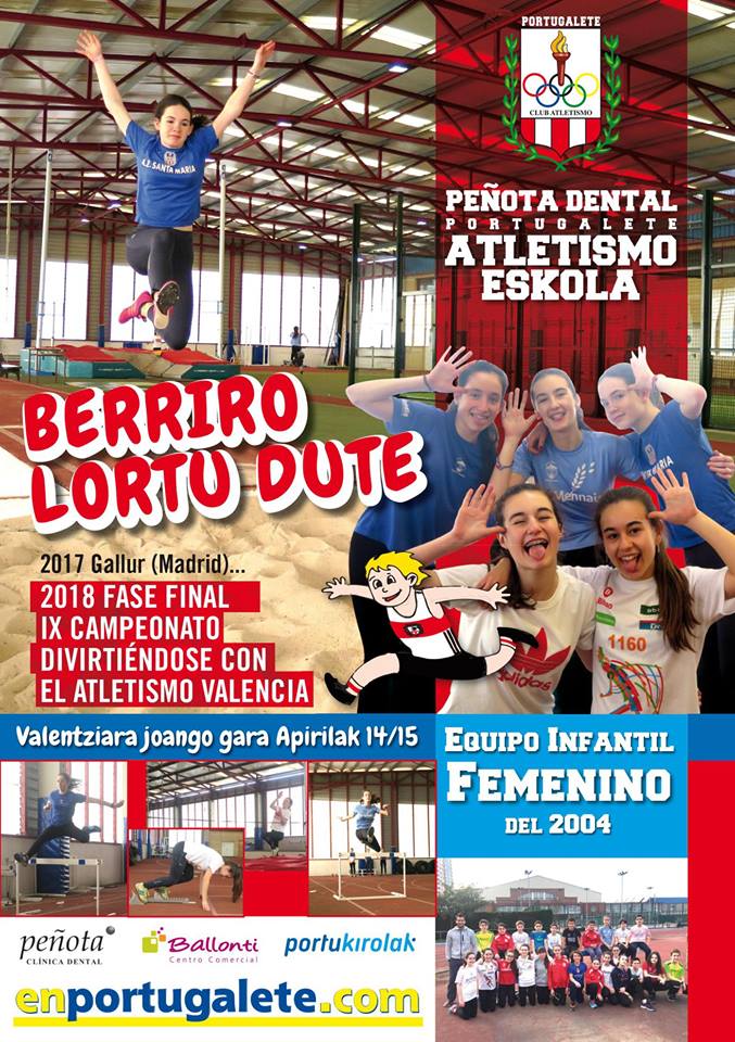 Si en 2017 consiguieron el billete para Gallur (Madrid)... en 2018 el equipo femenino del 2004 de Peñota Dental Portugalete Atletismo Eskola (Colegio Nuestra Señora del Carmen Portugalete, Gabrieltxo Celaya, Kanpazar Eskola, LaMennais Santa María Ikastetxea) se ha clasificado con la 5ª mejor puntuación de todos los centros aspirantes para la fase final de “Divirtiéndose con el Atletismo” en Valencia. Representando a sus 29 compañer@s de equipo Claudia Tajada, Jone Isusi, María Gil, Nerea Martínez y Oihane Gallo se medirán este fin de semana 14/15 de abril a los equipos de IES Peyeta Roja (Castellón), I.E.S. Lekeitio (¡¡enhorabuena Tximista Lekeitio!!), Colegio De Fomento Sansueña (Zaragoza), Colegio Montserrat (Barcelona), Colegio Estudio (Madrid), I.E.S. 8 De Marzo (Cantabria) en el Velódromo Luis Puig de Valencia. Enhorabuena a todo el equipo, familia, a su entrenador Ander Hurtado y a todos los entrenadores de la escuela del portu de LaMennais Santa María Ikastetxea que les han entrenado en categoría inferiores Alberto Barrio Cagigal, Iker Diez Beldarrain, Esther Fernández, Olatz Iglesias, Sergio Cuenca...